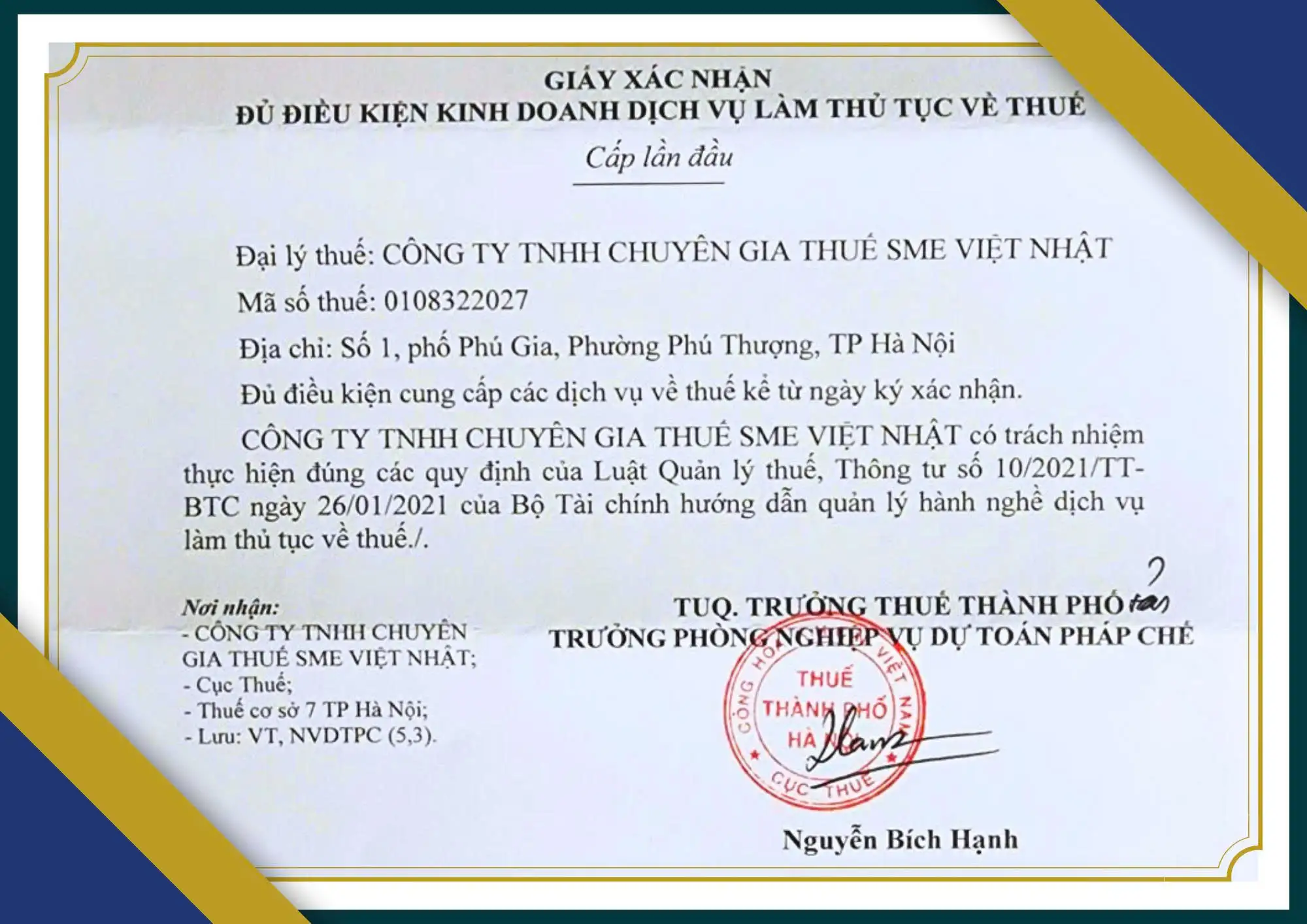 Chuyên Gia Thuế Việt Nhật là tổ chức có Giấy phép hành nghề dịch vụ làm thủ tục về thuế, đáp ứng đầy đủ tiêu chuẩn của Luật Quản lý Thuế.